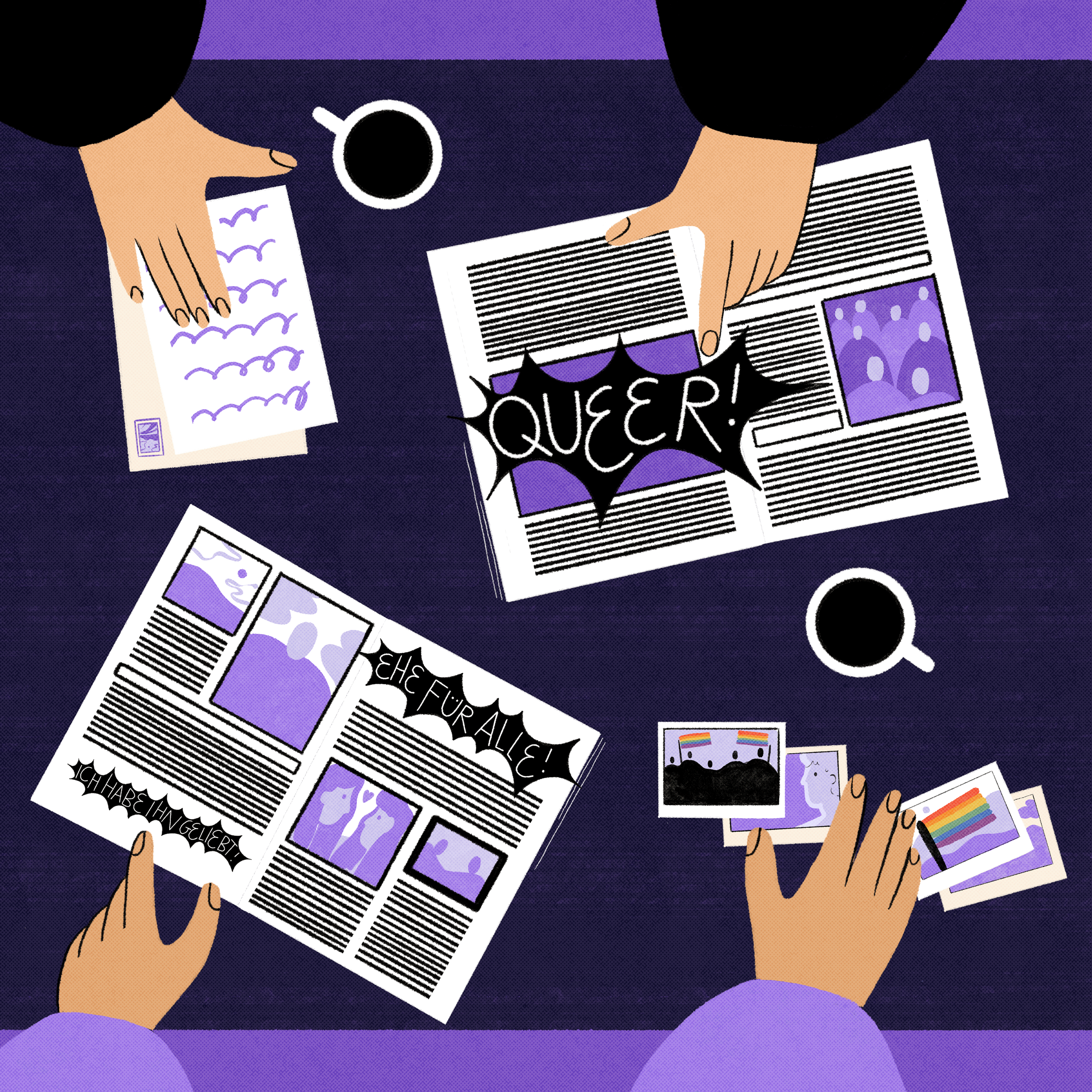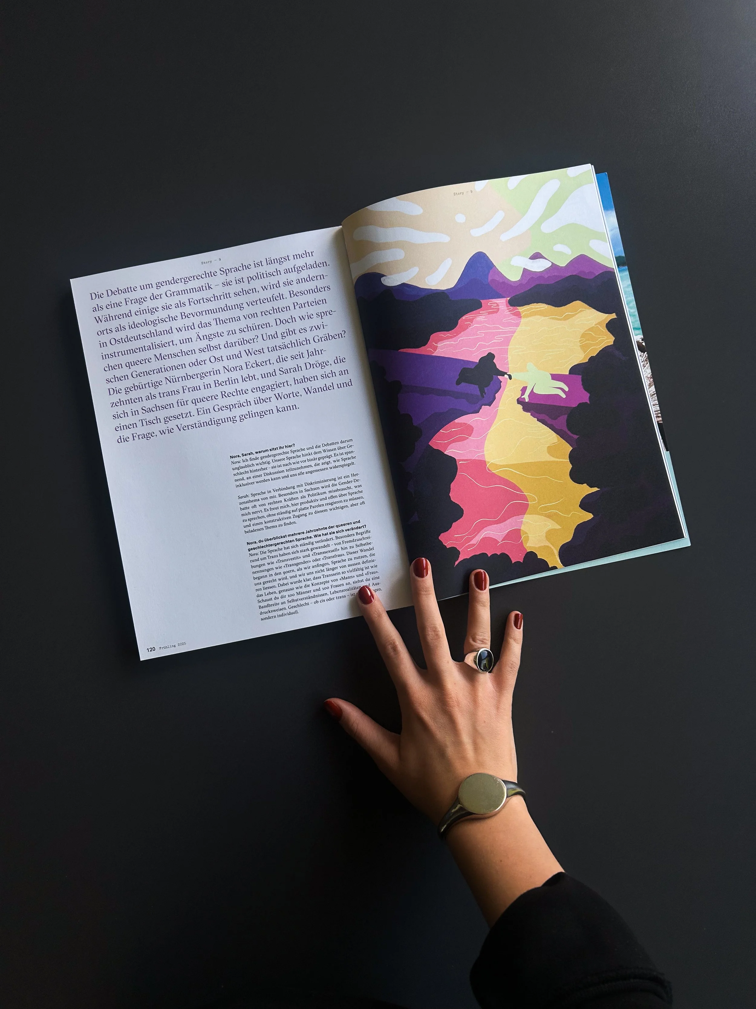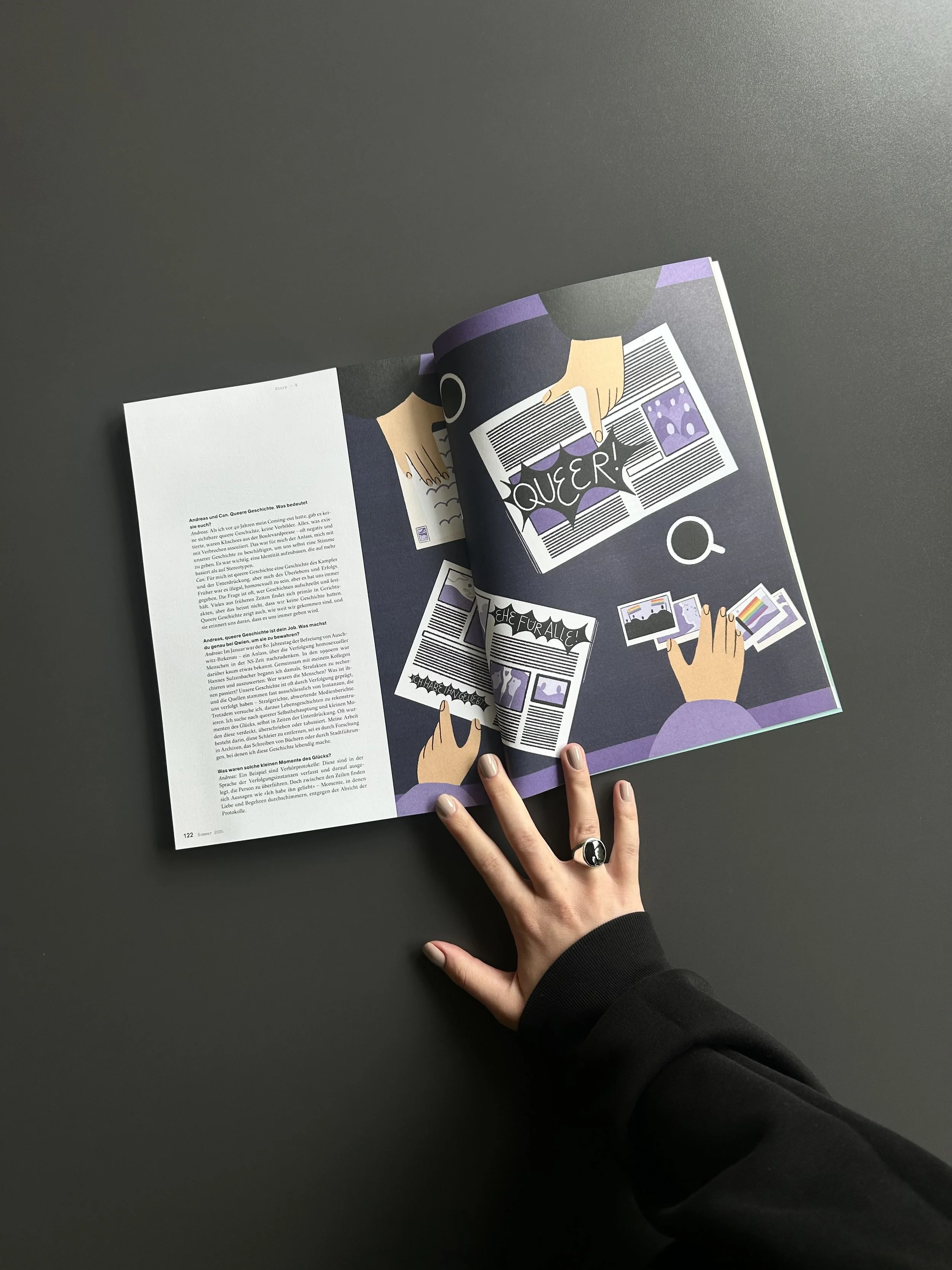 Mannschaft is a Swiss magazine for queer people. In 2025, I illustrated 3 articles written by Denise Liebchen in the spring (120), summer (121), and autumn (122) issue of the magazine.